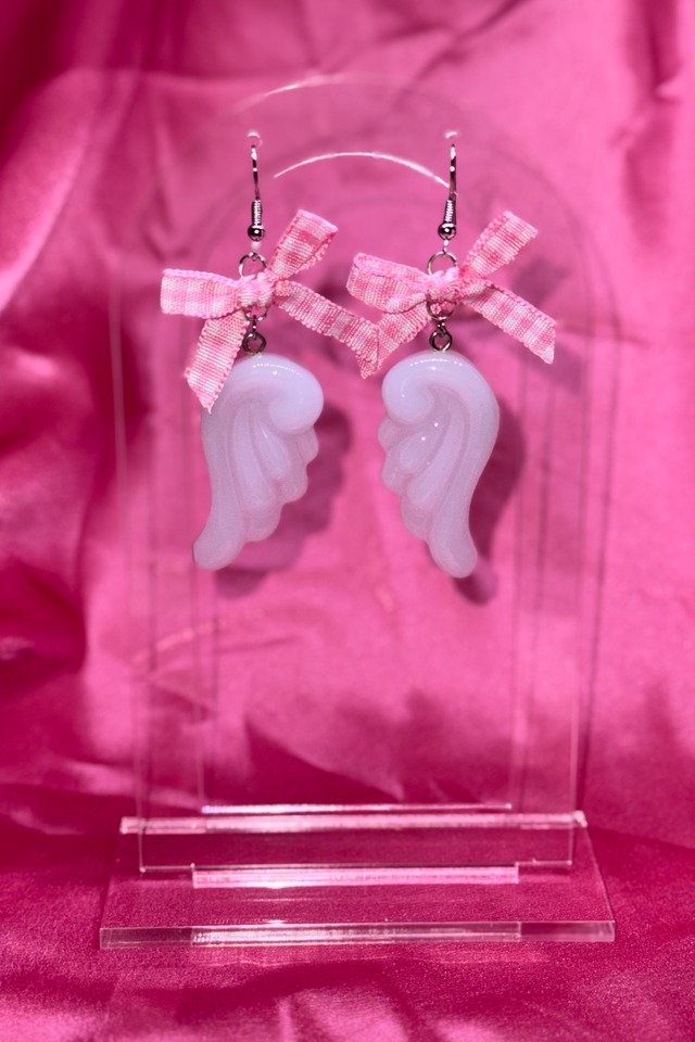 ゆらゆら揺れる天使の羽のピアス。 イヤリング、樹脂製のピアスに付け替えも可能です。 発送の際はシリコン製のピアスキャッチが付属します。 ⭐︎リボン〜モチーフまで約5cm ⭐︎形成・色付けからデコレーションなど、全て手作業で行っているため個体差がございます。 ⭐︎ハンドメイドのため強い衝撃、直射日光、高温多湿を避け、お取り扱いには十分ご注意ください。 天使界隈 ふわふわ バレエコア パステル ファンシー レトロ 原宿 ロリータ ロリィタ ゆめかわ